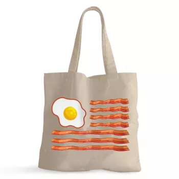 Bacon & Eggs USA Flag 100% Cotton Tote Bag – Funny Food Grocery Shopping Cloth Bag – American Breakfast Eco-friendly Tote Bag