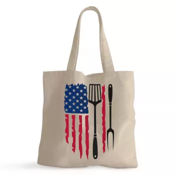 BBQ American Flag 100% Cotton Tote Bag – Fun BBQ Grocery Shopping Cloth Bag – Barbeque Party Eco-friendly Tote Bag